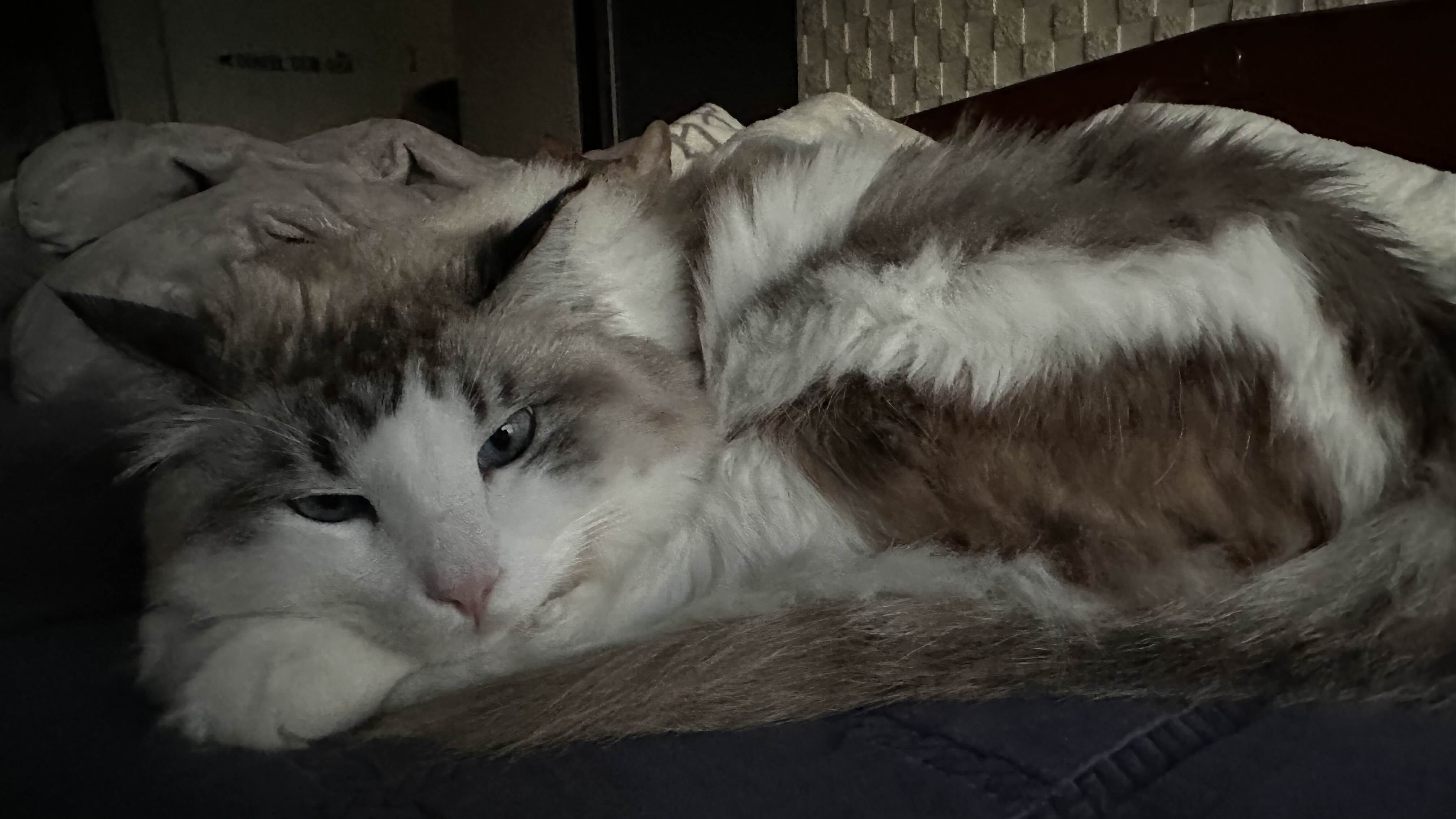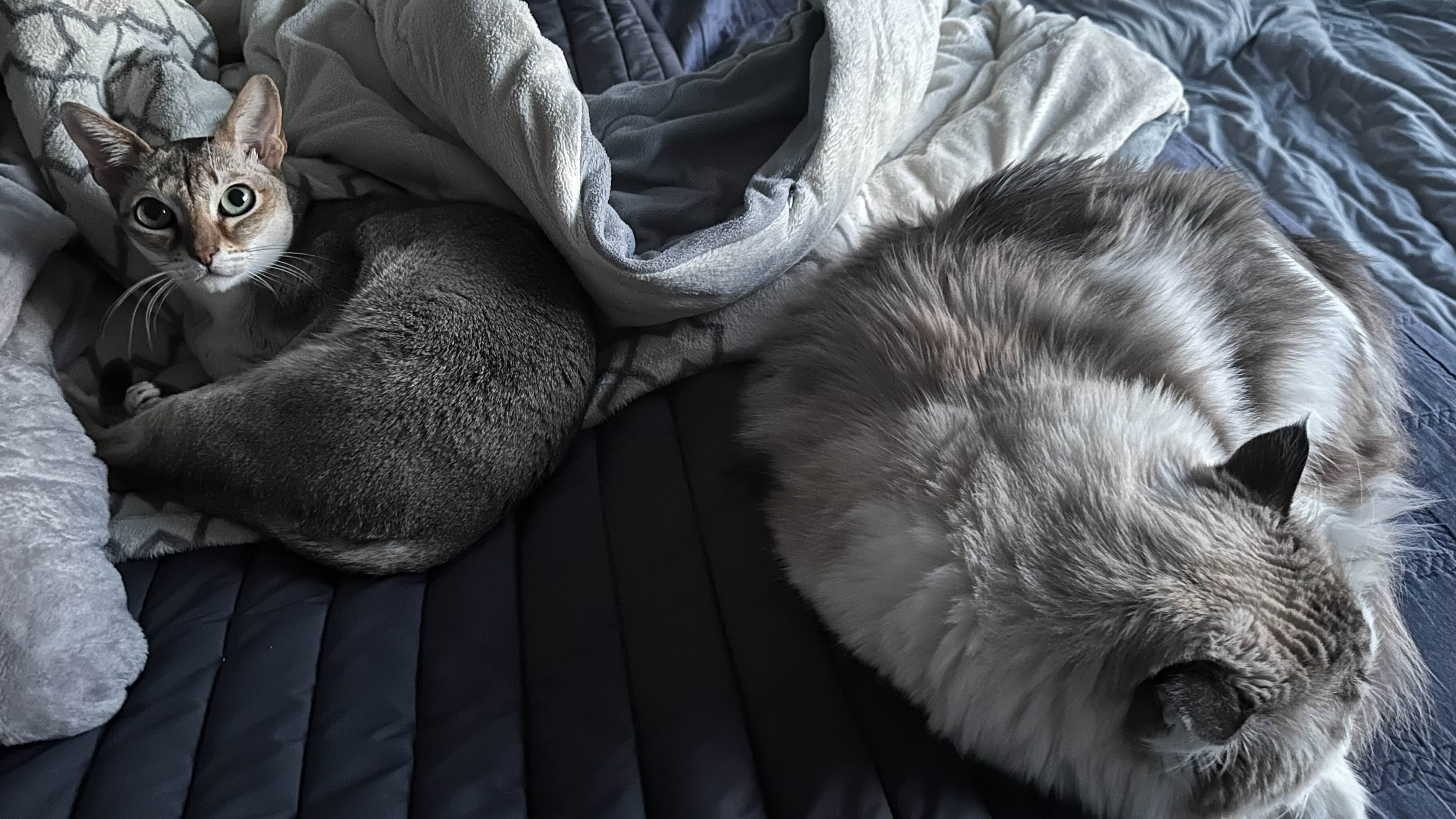 렉돌과 싱가푸라 고양이 둘이서 침대를 차지하고 자는 중